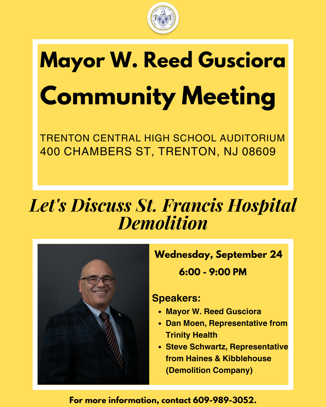 Community Meeting to Discuss St. Francis Hospital Demolition (hosted by Mayor W. Reed Gusciora), Wednesday, September 24, 6-9pm, Trenton Central High School Auditorium, 400 Chambers Street, Trenton.
